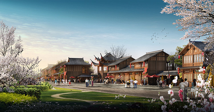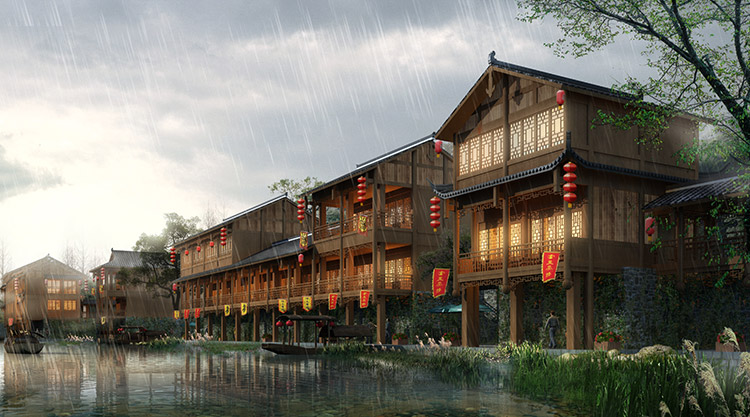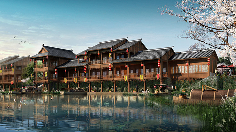 栗河吊腳樓沿河呈狹長(zhǎng)不規(guī)則帶狀,南北向進(jìn)深約25m,東西向?qū)捈s527m。項(xiàng)目占地面積12486.41平米(18.73畝),總建筑面積4520.87平米,分為A至J十個(gè)單體建筑,建筑層數(shù)1~2層,門面商鋪45間,沿河道均勻分布。建筑依據(jù)場(chǎng)地,與南側(cè)道路平行布置,建筑主入口面向場(chǎng)地南側(cè)道路,建筑沿河布局,底部1層為架空空間,其上為主體建筑,建筑整體風(fēng)格風(fēng)貌為仿明清時(shí)代,外觀簡(jiǎn)潔、大方,給人以明朗、周正的空間體驗(yàn)。契合時(shí)代新形象,尺度更為親切。場(chǎng)地內(nèi)部景觀主要由硬質(zhì)景觀與軟質(zhì)景觀共同構(gòu)成。硬質(zhì)景觀主要包括廣場(chǎng)、步道和活動(dòng)場(chǎng)地,軟質(zhì)景觀主要是綠化種植。
